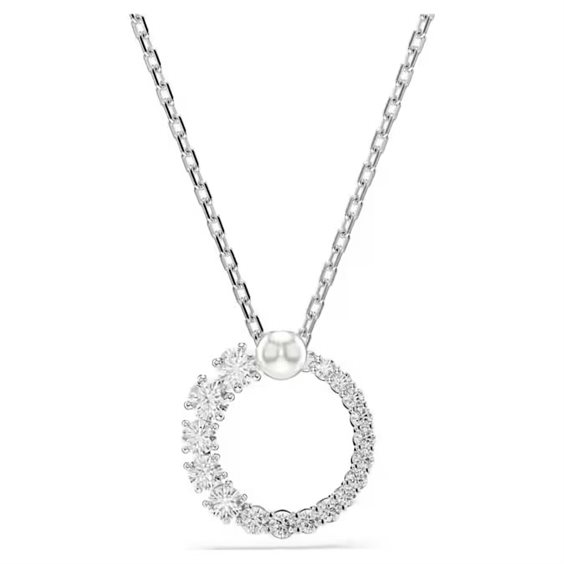 Con la sua classica silhouette e i dettagli contemporanei, questo elegante pendente Matrix attirerà su di sé ogni sguardo. Sospesa su una delicata catena, la creazione placcata rodio presenta un anello di Swarovski Zirconia trasparenti, di misure che variano da piccole a grandi, ed è terminato da una Crystal Pearl Swarovski bianca al centro. Indossalo da solo o abbinalo a orecchini coordinati per un’intensità a tutto volume. Articolo nr.: 5688751 Collezione: Matrix Lunghezza (minima - massima): 38 - 45 cm Dimensione decorazione: 1.7 x 1.6 cm Materiale: Cristalli, Placcatura rodio, Perla di cristallo, Zirconia Colore: Bianco Tipo di fermaglio: Moschettone