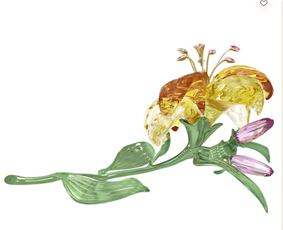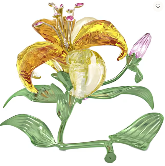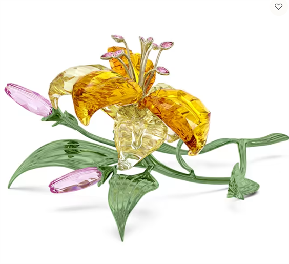 Il giglio è simbolo eterno di purezza e di innocenza. In questo emblematica raffigurazione realizzata in grandezza naturale, Swarovski ha magistralmente colto queste qualità con 633 brillanti sfaccettature. Ogni dettaglio del fiore è stato perfettamente modellato, rivelando brillanti tocchi di giallo e di rosa, ed eleganti steli e foglie in metallo laccato verde. Questa composizione orizzontale a sé stante è una creazione di grande effetto con cui impreziosire la tua tavola. Non sono necessari vasi né basi per esporla. Oggetto decorativo. Non è un giocattolo. Non adatto ai bambini di età inferiore a 15 anni. Articolo nr.: 5671725 Dimensione: 8.8 x 12.1 x 16.5 cm Designer: Adi Stocker Materiale: Cristalli, Metallo laccato Colore: Multicolore Collezione: Florere