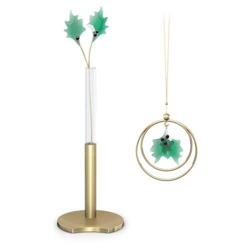 Questo bellissimo set rende omaggio a uno dei più amati simboli floreali festivi: le foglie di agrifoglio. Include un rametto di agrifoglio e una decorazione, con foglie e bacche finemente scintillanti in cristalli color rosso e verde, oltre al piccolo vado decorativo della serie Garden Tales. È perfetto da esibire durante le festività ed è un bellissimo regalo. Il rametto e la decorazione presentano ciascuno due foglie di agrifoglio e un trio di bacche, scintillanti con 149 sfaccettature e una struttura in metallo spazzolato color oro champagne, mentre il vaso è realizzato in vetro e metallo con placcatura in colori abbinati. Ispirata a uno stile moderno e minimalista, questo set aggiungerà uno stile raffinato ad una casa con i suoi toni caldi e le linee eleganti. Oggetto decorativo. Non è un giocattolo. Non adatto a bambini di età inferiore ai 15 anni.