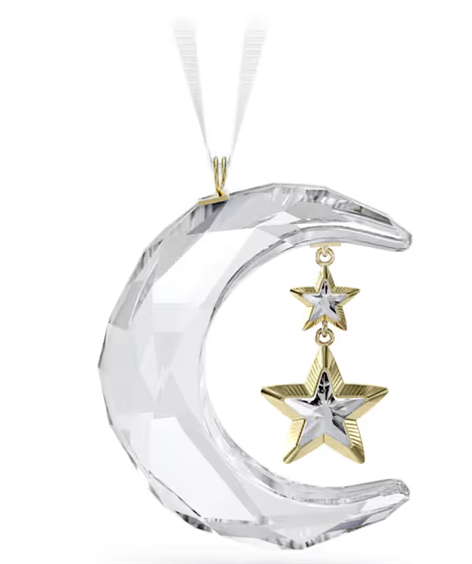 Traendo ispirazione da un cielo notturno stellato, questa maestosa decorazione conferirà un tocco celestiale a qualsiasi decorazione festiva. Lo scintillante design con 200 radiose sfaccettature, rappresenta una luna crescente con due stelle sospese, incastonate in una montatura in tonalità oro champagne. L’insieme è sospeso su un lussuoso nastro gros-grain bianco. Appendila a casa tua ed esprimi un desiderio per l’anno che verrà. Oggetto decorativo. Non è un giocattolo. Non adatto ai bambini di età inferiore a 15 anni.