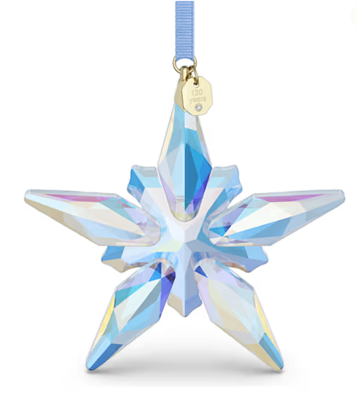 Questa splendida decorazione festeggia i 130 anni di creatività e savoir-faire di Swarovski. Sospeso su un nastro in gros-grain azzurro, il design a forma di stella è tagliato di precisione con 190 sfaccettature che catturano la luce e prende vita con un radioso bagliore grazie all’inconfondibile effetto Aurora Boreale. Una splendida incarnazione della complessa semplicità e dell’abilità tecnica di Swarovski, completata da una targhetta placcata in tonalità oro champagne, decorata con un singolo chaton e con la scritta “130 years” incisa. Un modo davvero vivace per celebrare questo importante anniversario di Swarovski. Oggetto decorativo. Non è un giocattolo. Non adatto a bambini di età inferiore ai 15 anni. Articolo nr.: 5701844 Collezione: Annual Edition Dimensione: 10.9 x 1.8 x 9.4 cm Designer: Michele Blasilli Materiale: Cristalli, Poliestere, Metallo finitura tono dorato champagne Colore: Blu