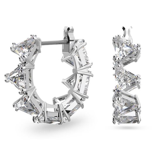 Suscitano grande emozione, nonostante le dimensioni sottili; questi delicati orecchini a cerchio sono l'essenziale del guardaroba moderno. Lavorati con una fila di pietre taglio triangle tessellate, sono montati su un’incastonatura elegante placcata rodio. Indossali per lanciare un sottile messaggio, oppure sovrapponili con stili più massicci per un look a strati. Questi orecchini sono parte della famiglia Matrix e sono firmati dal Direttore creativo Giovanna Engelbert per la Collection II.