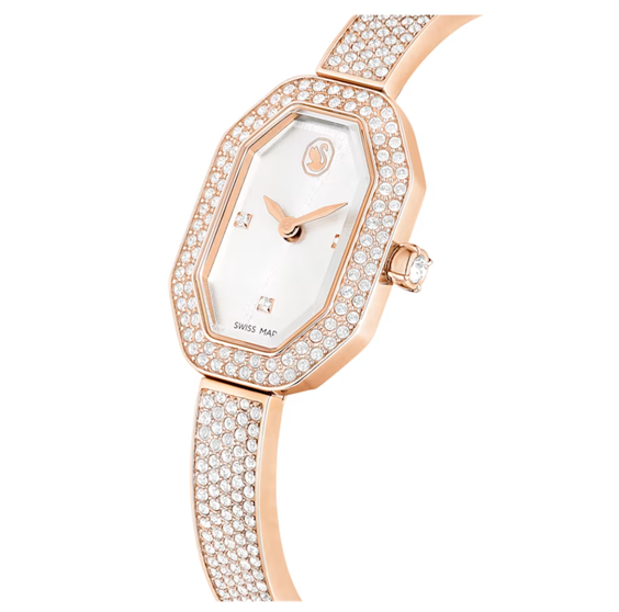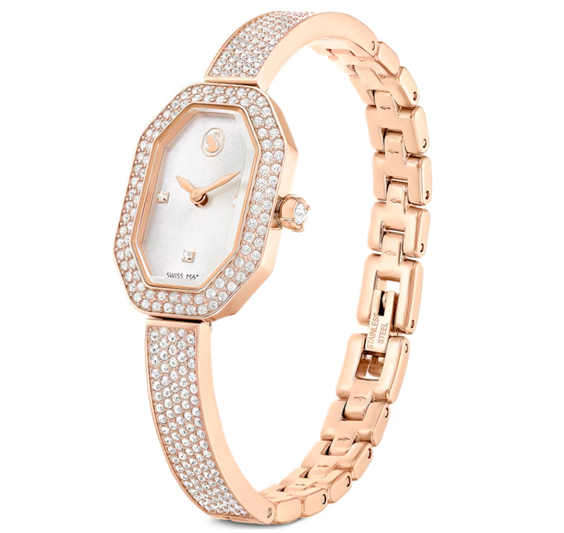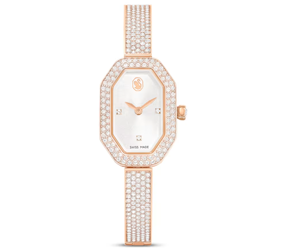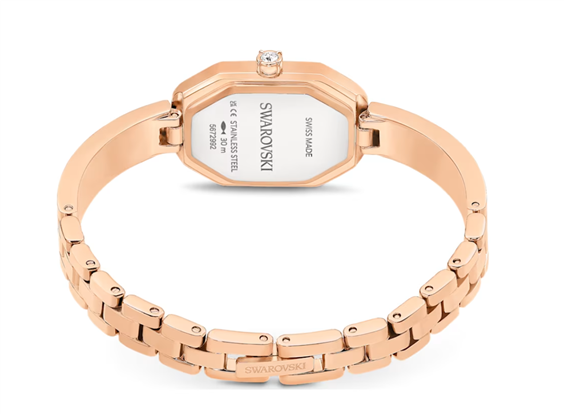 Questo orologio con bangle Dextera, che cattura ogni raggio di luce, è realizzato nell’iconica e rinomata forma ottagonale Swarovski. La cassa di 20 mm x 30,5 mm presenta una finitura color oro rosa ed è impreziosita da un pavé di 92 cristalli sulla lunetta. Questo crea un setting perfetto per il quadrante con motivo sunray, che presenta un logo cigno posizionato alle ore 12 e tre indici in cristallo. Oltre ad un singolo cristallo scintillante incastonato sulla corona, l’orologio si arricchisce di 194 cristalli montati lungo il bracciale regolabile, per un tocco di eccezionale bellezza ad ogni ora. Questo orologio Swiss Made è resistente all’acqua fino a 30 m e unisce una gioiosa stravaganza al caratteristico savoir-faire Swarovski. Articolo nr.: 5672992 Collezione: Dextera Bangle Dimensioni della cassa: 30.5 mm x 19 mm Lunghezza del cinturino dell'orologio: 16 cm Materiale: Cristalli, PVD oro rosa Colore: Color oro rosa Materiale del cinturino: Metallo Prodotto in: Svizzera Meccanismo dell'orologio: Quarzo