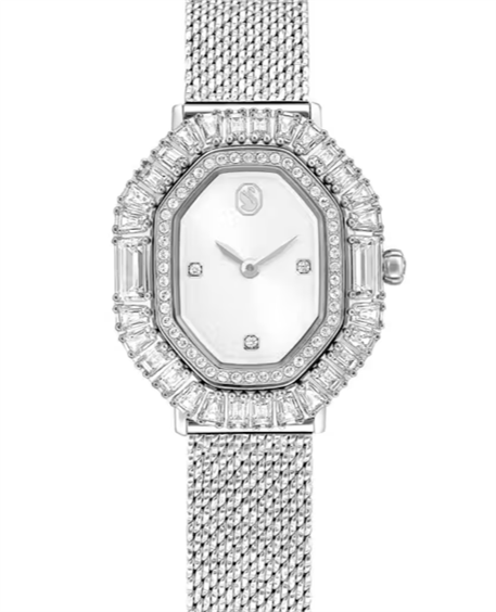 Questo innovativo orologio è una creazione unica nel suo genere che combina il design distintivo con la maestria della luce. Realizzato con autentico savoir-faire, l’orologio è ispirato alla famiglia di gioielli Matrix e presenta una cassa in acciaio inossidabile di 13 x 18 mm. La lunetta è presentata nell’iconica forma ottagonale di Swarovski e include un meraviglioso mix di 78 cristalli Cry e Swarovski Zirconia taglio Round e Fancy incastonati. Si crea così una radiosa cornice per il quadrante minimalista con motivo sunray, che mostra elegantemente tre indici delle ore in cristallo e un logo cigno. Un singolo cristallo è inoltre posizionato all’interno della corona, mentre intorno al polso, il lusso è ulteriormente accentuato da un bracciale in mesh regolabile. Questo orologio è resistente all’acqua fino a 50 m e simboleggia il moderno lusso di Swarovski nella sua espressione più pura.