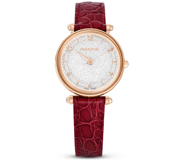 Questo incantevole orologio incarna meravigliosamente lo spirito della famiglia Crystalline Wonder in tutto il suo splendore. Realizzata con una finitura color oro rosa, la cassa di 35mm presenta anse sapientemente modellate con una singola pietra Cry ad ogni estremità, e un’ulteriore pietra posizionata nella corona. Il vetro bombato custodisce il quadrante dell’orologio, meravigliosamente decorato da numeri arabi e circa 1.000 cristalli, che creano un effetto di grande risalto. Resistente all'acqua fino a 50m, questo splendido orologio Swiss made è dotato di un cinturino in pelle di vitello italiana rossa, a rilascio rapido e con motivo lucertola in rilievo. Una scelta di grande impatto per il tuo stile di tutti i giorni o un regalo intramontabile per una persona cara. Articolo nr.: 5656905 Collezione: Crystalline Wonder Colore: Rosso Dimensioni della cassa: 35 mm Lunghezza del cinturino dell'orologio: 16.5 cm Materiale: Cristalli, PVD oro rosa Tipo di fermaglio: Fibbia Prodotto in: Svizzera Meccanismo dell'orologio: Quarzo