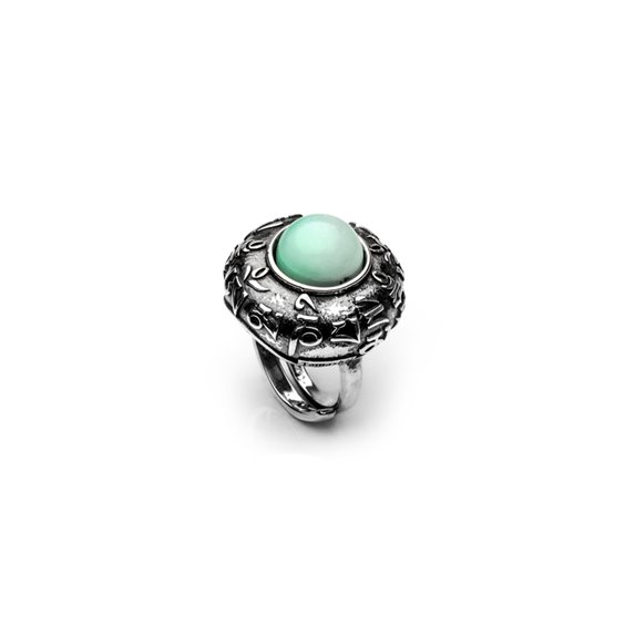 In Tibet il Lamaismo si divide in diverse scuole. Tra le più caratteristiche e antiche c’è quella dei rNin ma pa, “gli antichi”, la seconda scuola. I loro monaci indossano diversi copricapi, ognuno dei quali identifica il ruolo gerarchico e spirituale all’interno della stessa scuola. I loro monaci indossano diversi copricapi, ognuno dei quali identifica il ruolo gerarchico e spirituale all’interno della stessa scuola. Il copricapo DVAGS ZVA venne indossato da Gampopa, uno dei principali maestri della scuola Kagyu del Buddismo tibetano che, secondo la leggenda, prese forma da un paio di scarpe donategli da Mi la ras pa (Milarepa), a cui era fortemente devoto. Anello originale Tamashii DVAGS ZVA arricchito con pietre naturali AGATA azzurro cielo. Realizzato in Argento 925‰, misura regolabile, riporta il mantra “Om Mani Padme Hūm” del Buddha della compassione Cenresig, tra i più noti e diffusi mantra del Buddhismo.