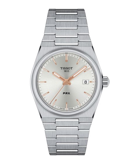 Nel 1978 Tissot creò un modello al quarzo, caratterizzato da una cassa sottile, indici stretti e un bracciale in acciaio. La sua ampia ansa orizzontale, tipica dell'epoca, era perfettamente integrata nella cassa piatta a forma di tonneau. Pochi anni dopo, Tissot ha registrato il nome PRX. "PR" sta per "preciso" e "robusto". La "X" sta per il numero romano dieci e per la pressione di 10 bar che l'orologio è in grado di sopportare. Nel 2021 Tissot ha presentato il PRX 40205, È una versione moderna del modello precedente con diametro 40mm. Nel 2022 la famiglia si allarga con nuovi modelli dal diametro di 35mm adatti ai polsi più piccoli di uomini e donne oltre che ragazzi. La cassa è in acciaio inossidabile 316 con una forma leggermente tonneau ed è ornato da una lunetta stretta e rotonda. Ai lati, spazzolate verticalmente, finiture arrotondate si alternano a sfaccettature lucide. La flessibilità e morbidezza delle maglie ne fanno un vero successo di design ergonomico e trasmettono uno straordinario comfort. Le lancette del PRX 40 205 sono dotate di un rivestimento SuperLumiNova® e sono posizionate l'una sull'altra con uno spazio minimo. Ciò consente di avvicinare il quadrante al vetro dell'orologio. L'effetto ottico ottenuto dai designer Tissot fa sembrare la cassa dell'orologio ancora più piatta e sottile di quanto non sia in realtà.