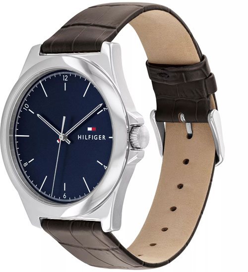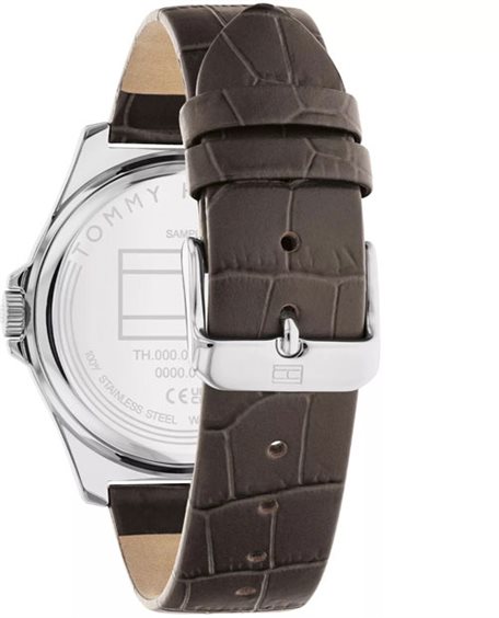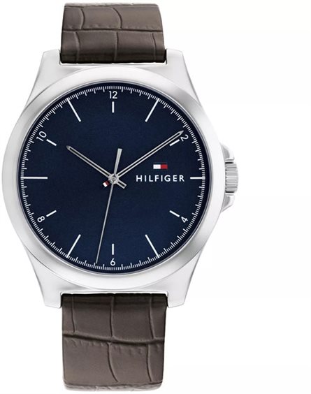 Braccialetto Cinturino in pelle marrone in simil-coccodrillo Caso Cassa in acciaio inossidabile color argento Corona Corona color argento nello stile di una moneta con protezione della corona Digitare Quadrante blu con indice a barre argentate e numeri arabi, bandiera Tommy Hilfiger e marchio sul quadrante Dimensioni Diametro: 42 mm Funzioni Ora, minuto, secondo Lunetta Lunetta color argento Orologeria Quarzo Persiana Fibbia Puntatore Lancette color argento Tenuta stagna Impermeabile fino a 3 bar. Ciò corrisponde a circa 30 metri. Ulteriori informazioni ... Vetro dell'orologio Minerale Visualizzazione del tempo Analogo