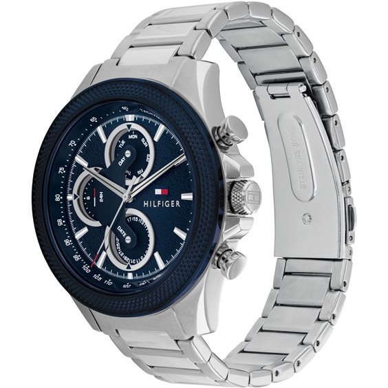 Orologio da uomo Tommy Hilfiger della collezione Clark. Il movimento dell'orologio è al quarzo con funzioni datario, indicazione giorno della settimana ed indicazione delle 24h giornaliere. La cassa dell'orologio è realizzata in acciaio, diametro 46 mm. Il bracciale dell'orologio è realizzato in acciaio. Il quadrante è di colore blu. La resistenza all'acqua è di 5 ATM / 50 metri.