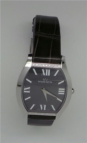 Orologio solo tempo, movimento al quarzo, cassa in acciaio lucido, quadrante color grigio canna di fucile, brillanti sulla cassa 0.11 H VVS, resistente all'acqua 5 bar, fondo cassa con viti.